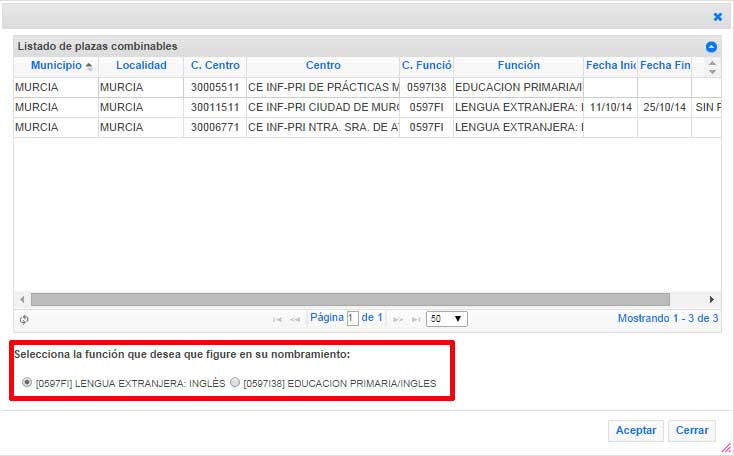 3.- Deberemos poner el cursor encima de la vacante que nos interesa y hacerle clic en ella. Si es de la misma especialidad en la parte de abajo nos saldrá la Función/Especialidad por la que nos harán el nombramiento. Si las parciales son de especialidades distintas podremos elegir la especialidad por la que queremos que nos nombren, como podeís ver en esta imagen: