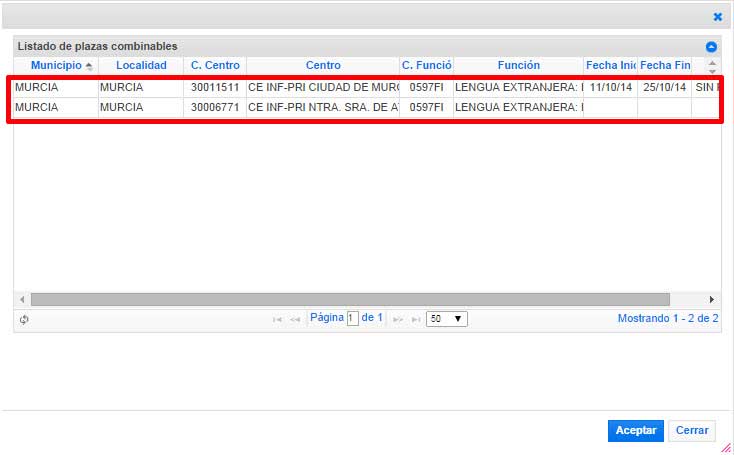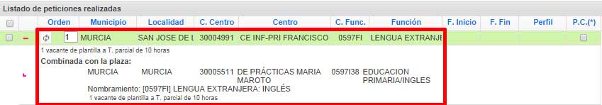 5.- Finalmente, comprobamos que en nuestra lista de peticiones, debajo de las vacantes, sale todo correctamente como lo hemos indicado, es decir, primero la vacante a la que le dimos a COMB y debajo la que hemos seleccionado en la ventana que se abrió